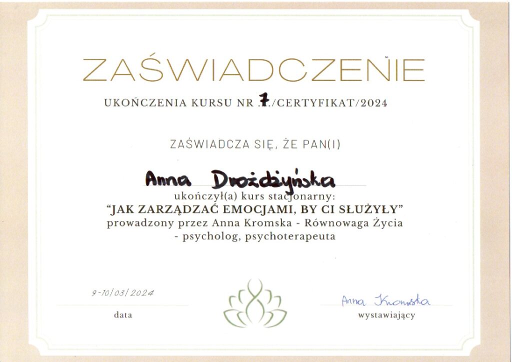 - Anna Kromska: „Jak zarządzać emocjami, by Ci służyły”, kurs stacjonarny;
