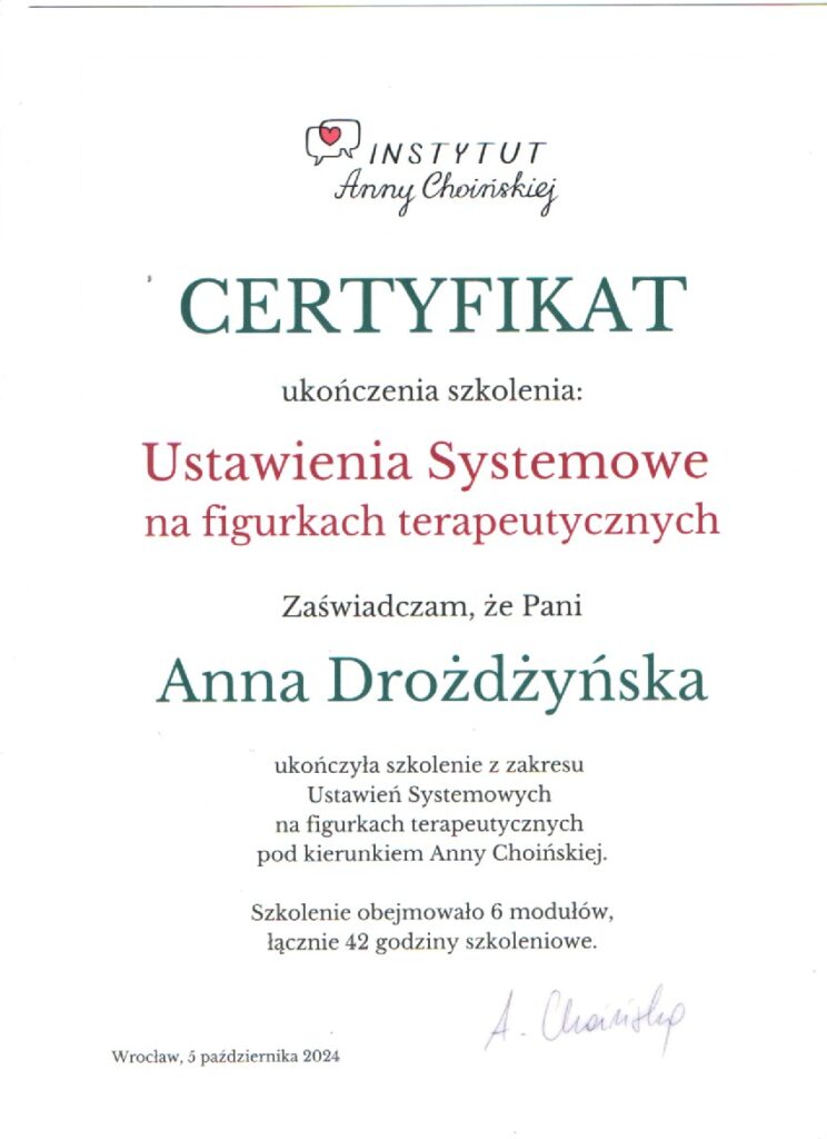 Nazywam się Anna Drożdżyńska. Jestem terapeutką Ustawień Systemowych według metody Berta Hellingera.